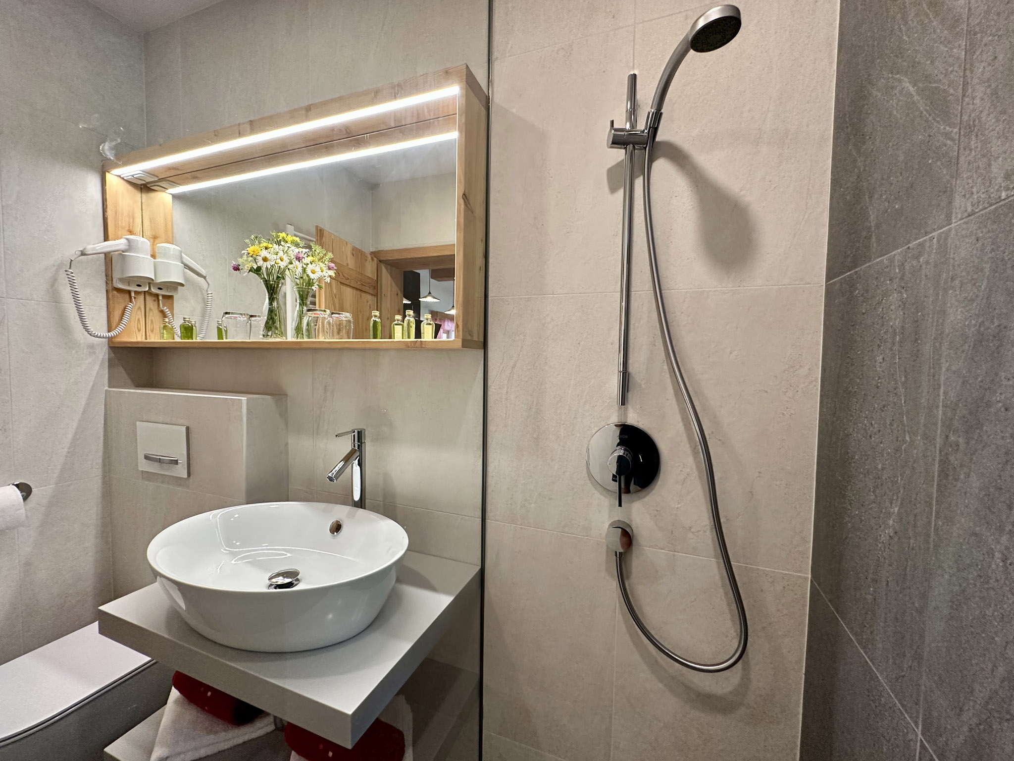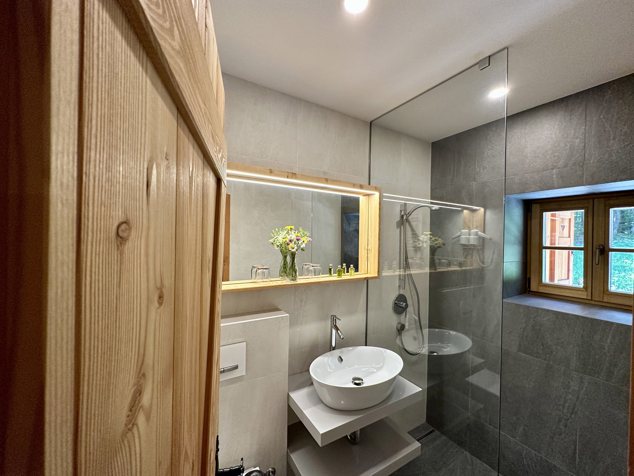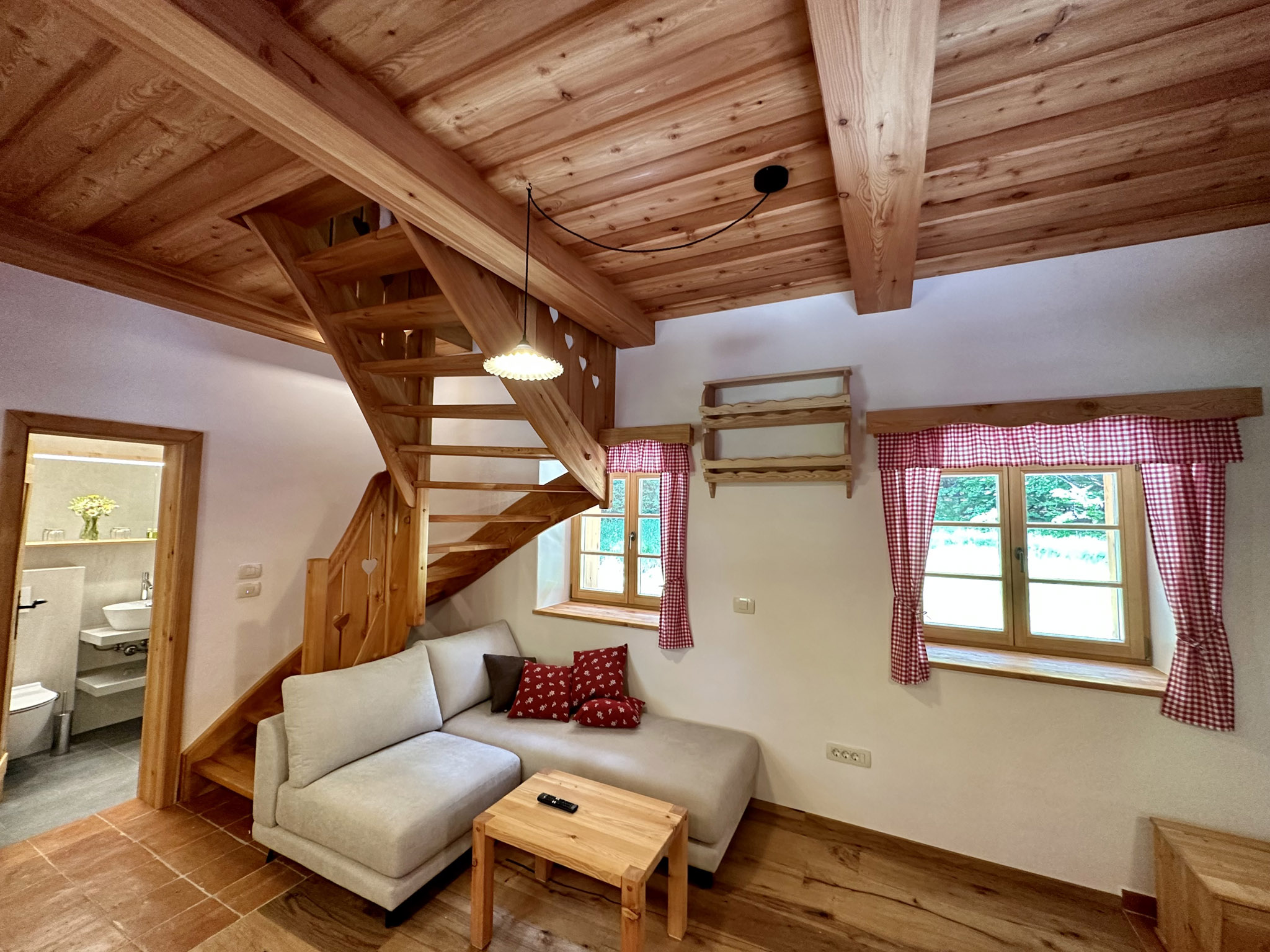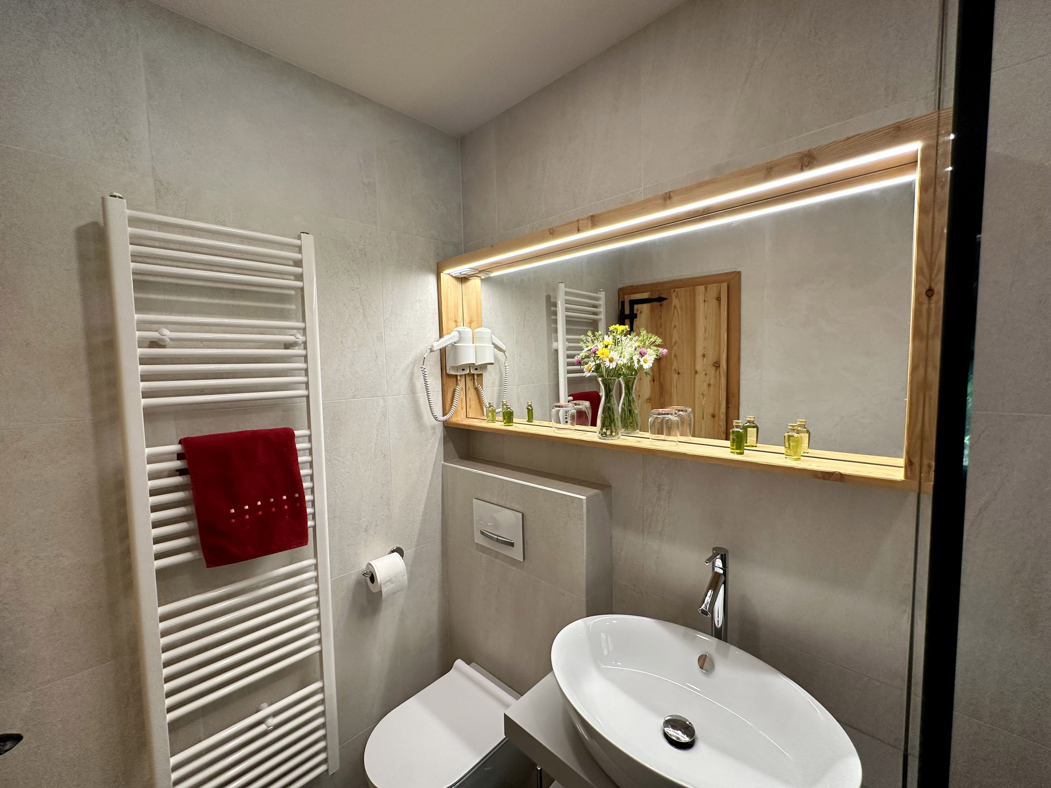 Apartma je velik 63m2 in ima lastno kopalnico ter gleda na bližnje hribe.